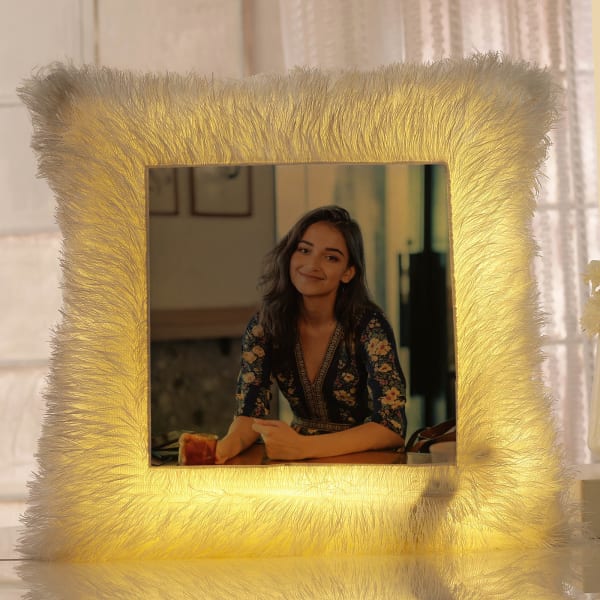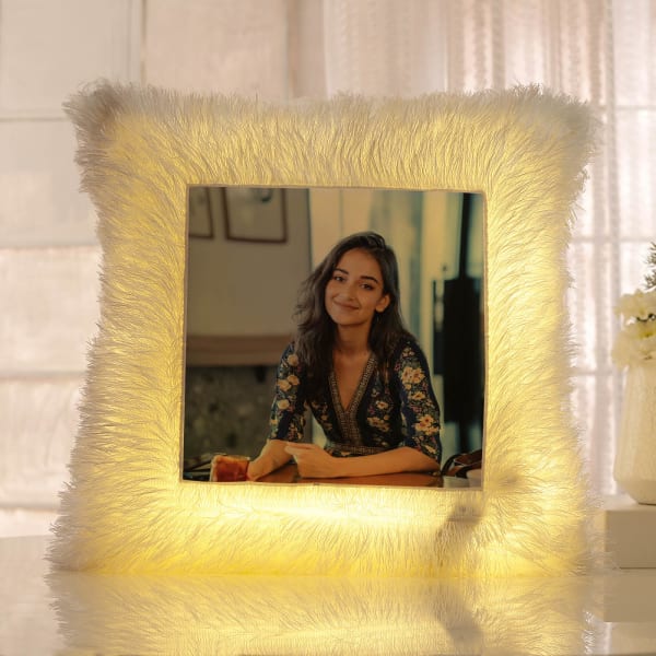 Make your beloved lady light up in joy with this quirky cushion. Crafted with high-quality materials, this cushion is soft and durable, ensuring it becomes a one-of-a-kind gift that your loved ones will cherish for years. The beautifully designed square-shaped cushion features faux fur, and its built-in soft yellow LED lights add an enchanting touch. Make this cushion truly special by personalizing it with their picture.